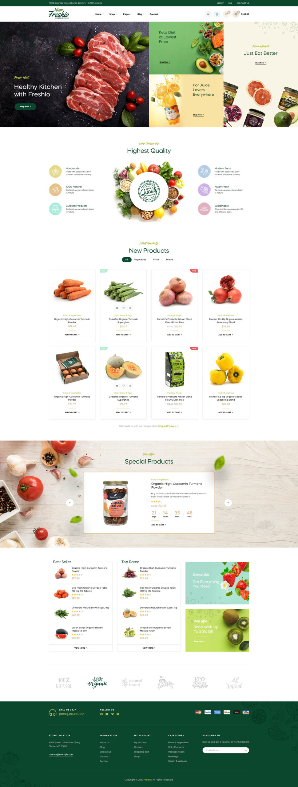 Dzięki projektowi, który tworzy świeży klimat sklepu z naturalną żywnością, ten kolorowy, ekologiczny sklep – Freshio – przyciągnie uwagę Twoich klientów od pierwszego wejrzenia. Ten motyw kulinarny jest kompatybilny ze wszystkimi urządzeniami i przeglądarkami . Dzięki temu odwiedzający Twoją witrynę mogą cieszyć się tym samym doświadczeniem, niezależnie od tego, czy korzystają z telefonów komórkowych i tabletów, czy komputerów stacjonarnych, przeglądarek Chrome lub Safari… Co więcej, jest on zoptymalizowany pod kątem SEO, szybkości ładowania stron i wydajności , co zwiększa współczynnik konwersji Twojej witryny. Motyw spożywczy został stworzony w kreatorze stron Elementor. Możesz stworzyć stronę internetową bez konieczności znajomości kodowania.